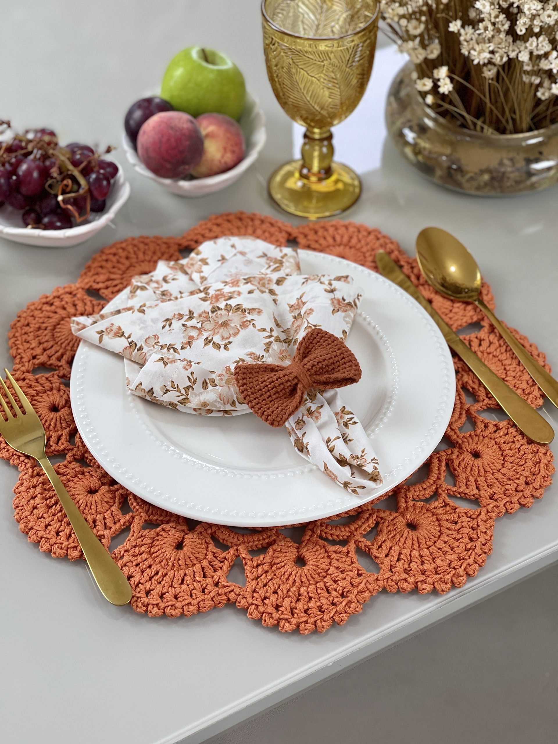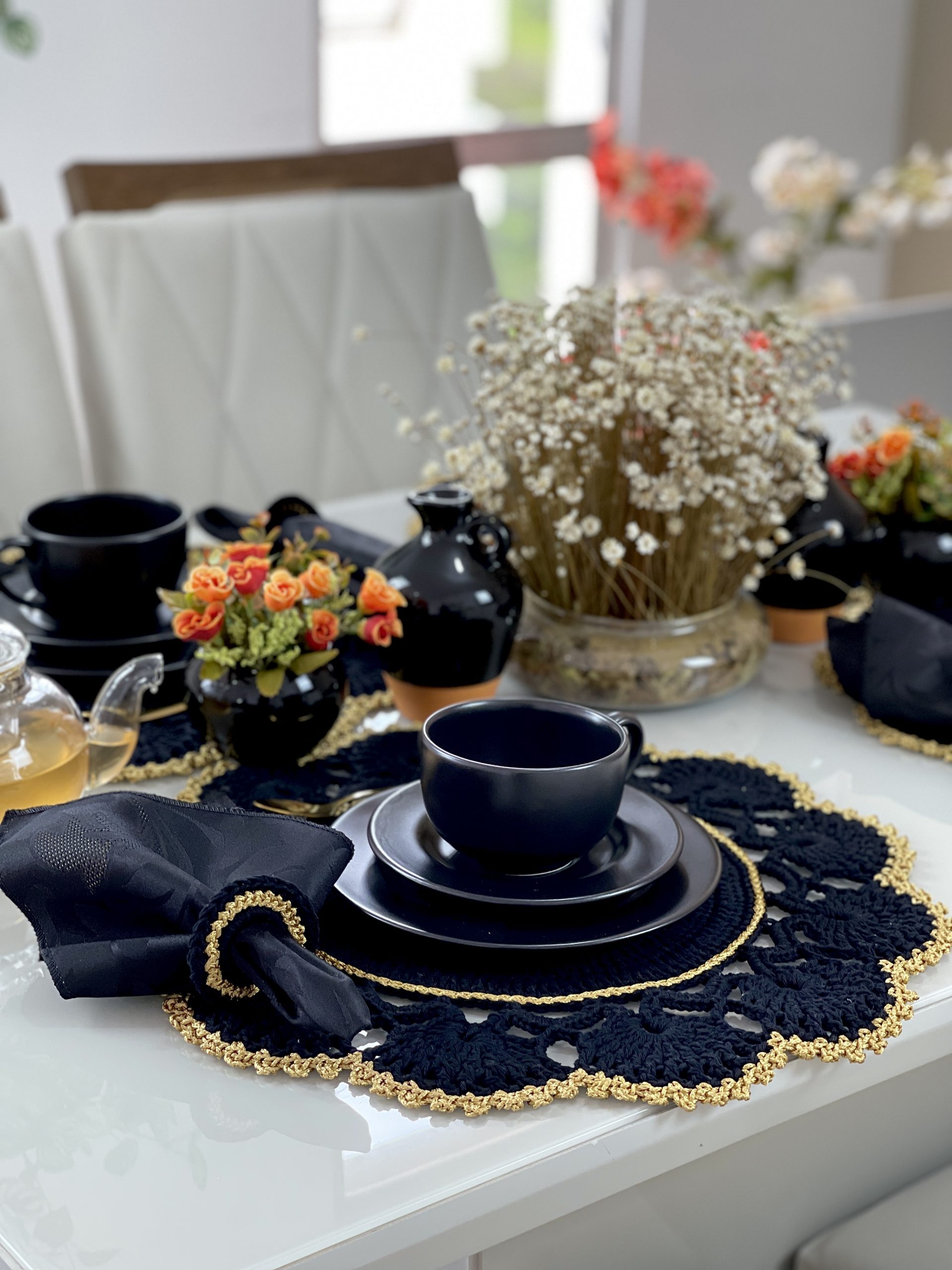 Confeccionado artesanalmente em crochê de alta qualidade, este modelo apresenta uma base sólida em preto profundo com um acabamento rendado impecável. O detalhe final em fio dourado metalizado confere um brilho sutil, tornando-o a escolha perfeita para jantares festivos, celebrações de Réveillon ou ocasiões que pedem elegância.