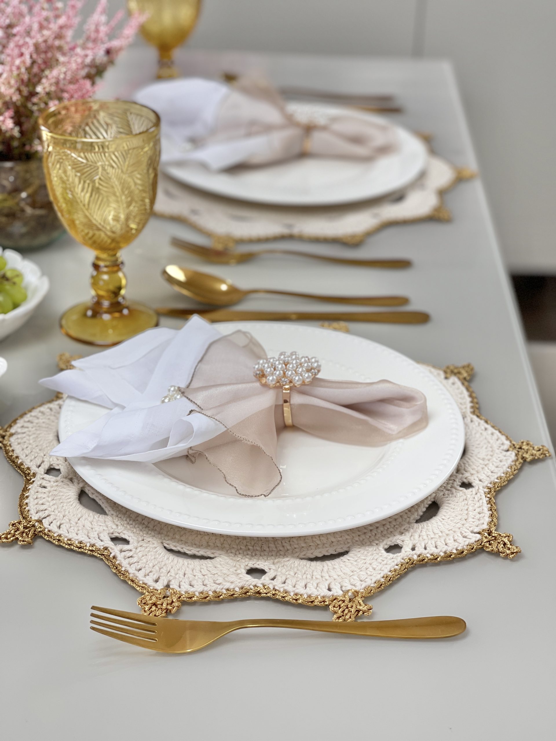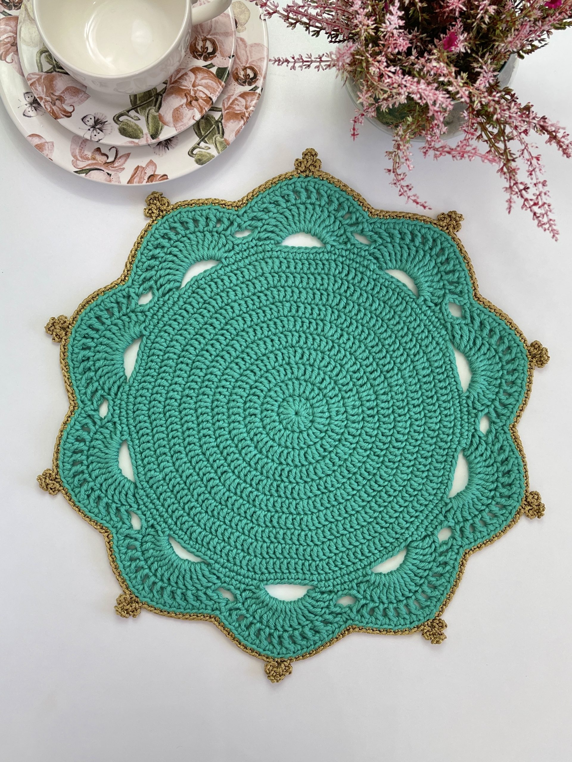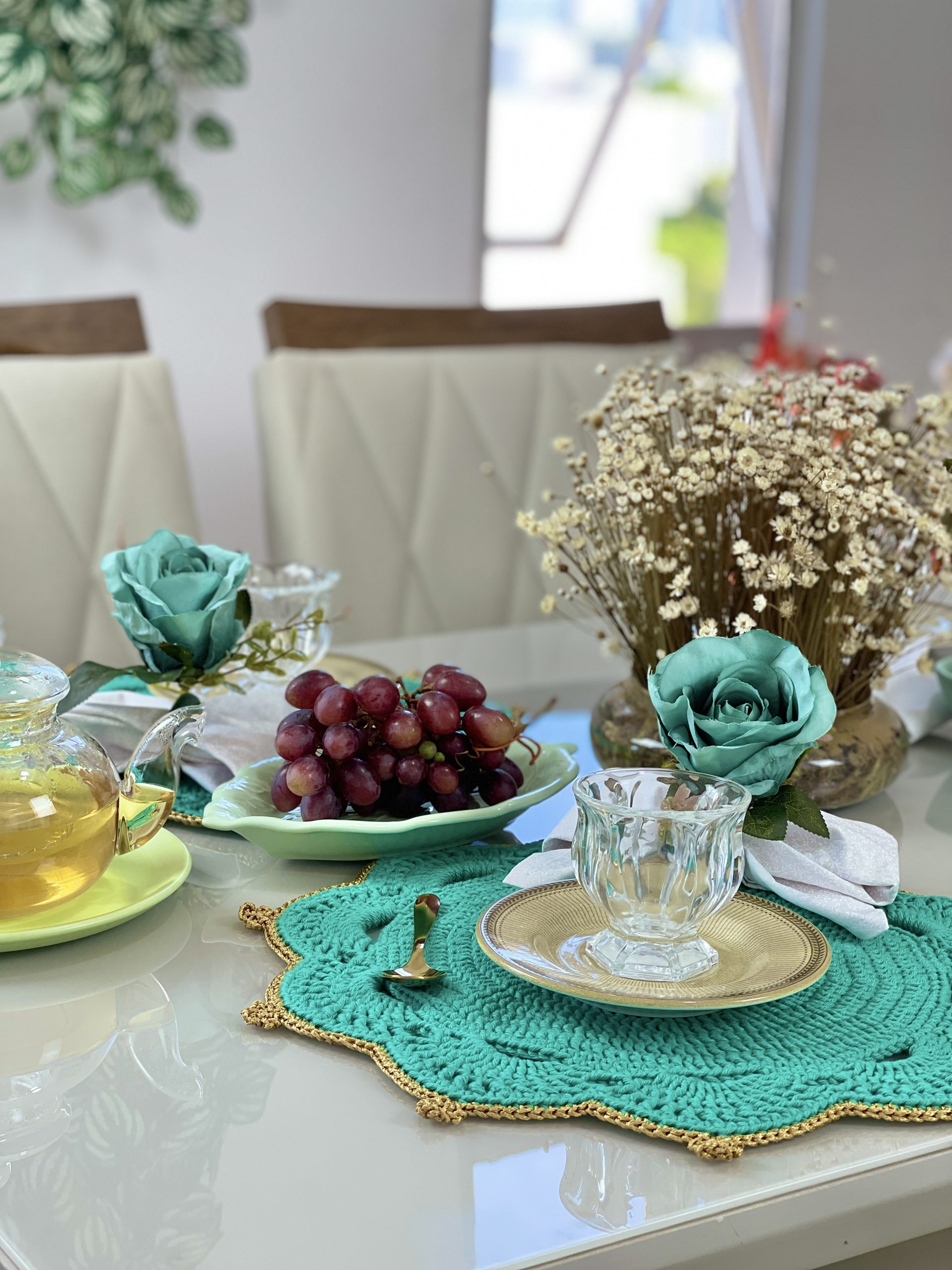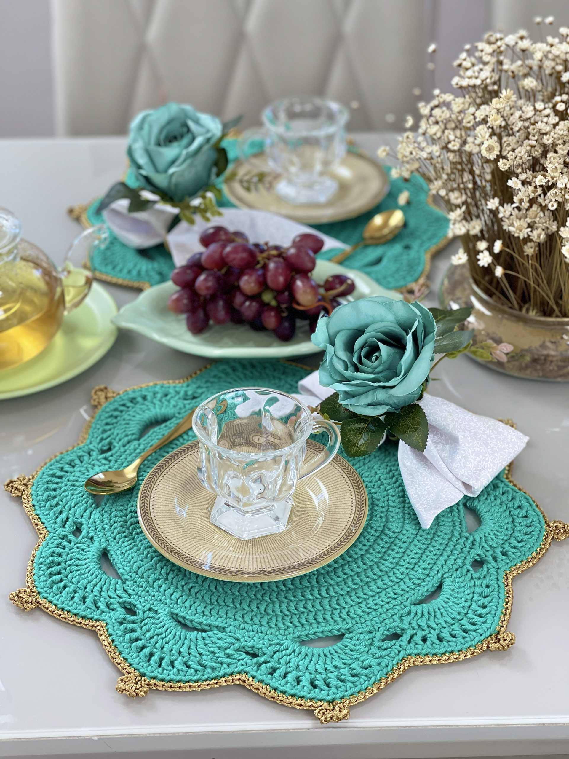 O Modelo Jaspe combina a vivacidade do verde-piscina com a sofisticação de um contorno dourado impecável. Com um design moderno e bordas em arcos, ele é a escolha ideal para quem deseja uma mesa iluminada, alegre e com um toque de exclusividade artesanal.