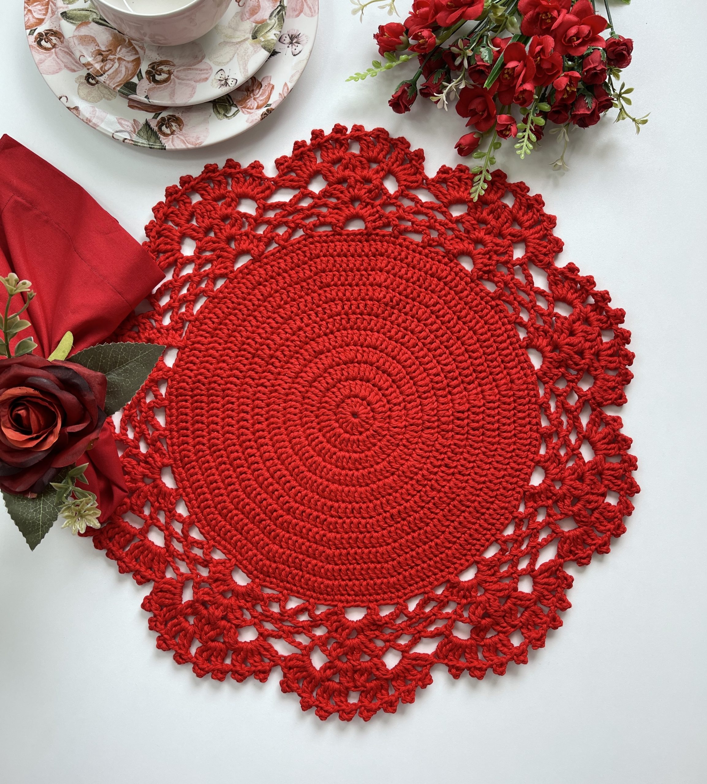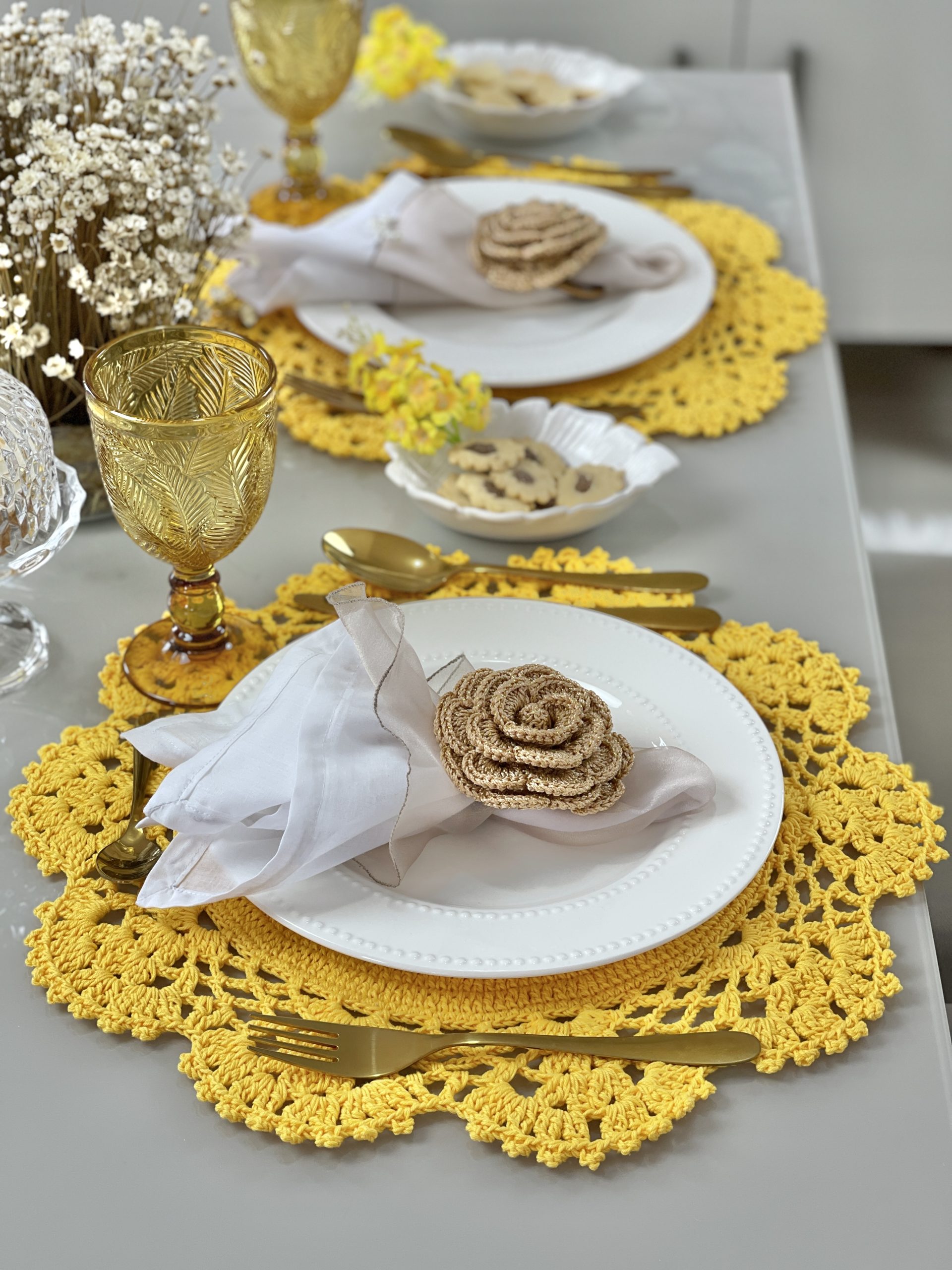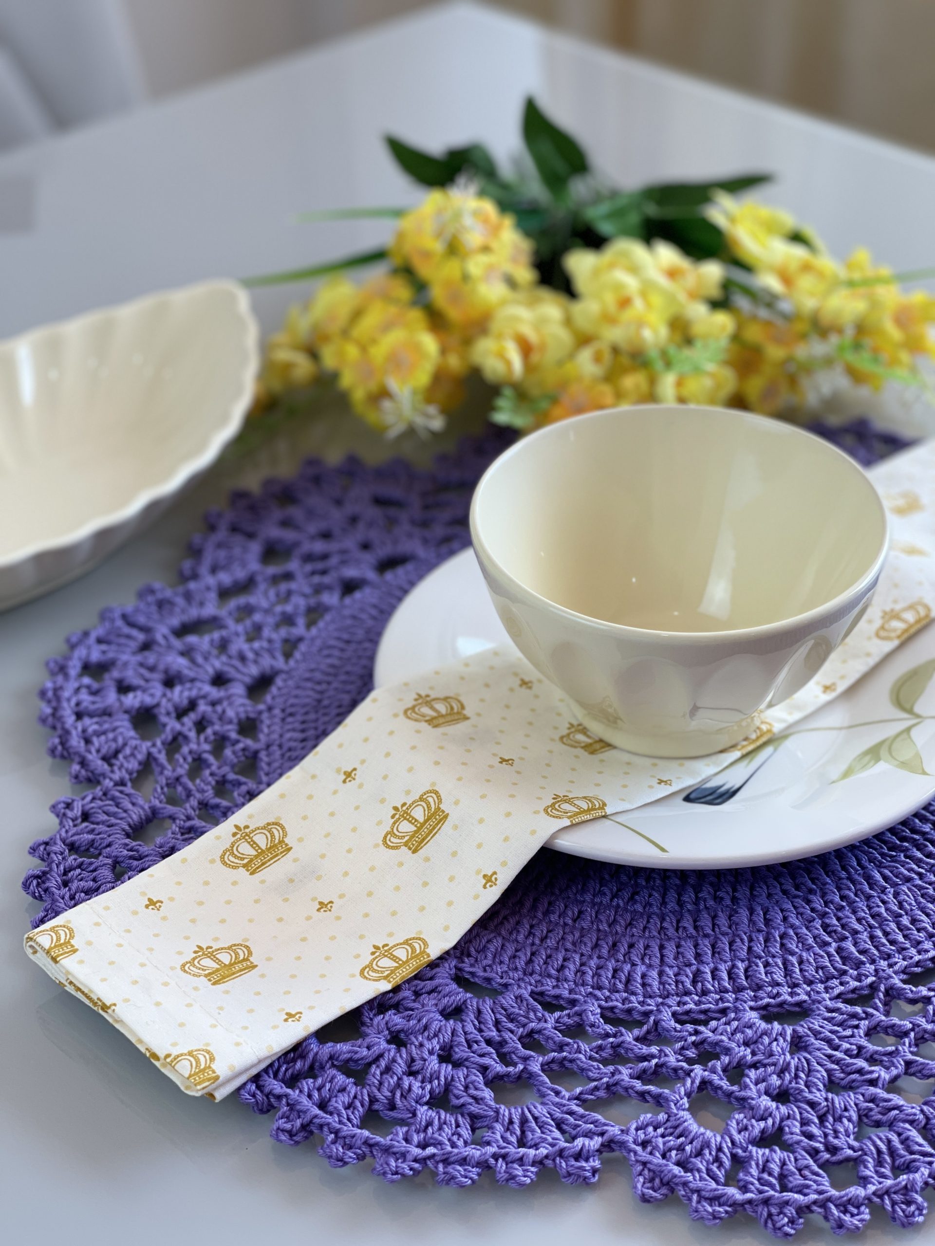 Lugar americano em crochê, confeccionado em fios 100% algodão, com medidas aproximadas de 40 cm de diâmetro.